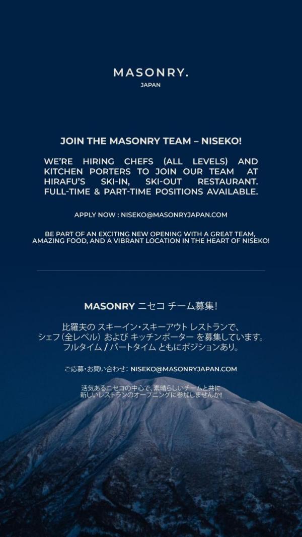 Join the Masonry Team – Niseko! We’re hiring Chefs to join our team at Hirafu’s ski-in, ski-out...
